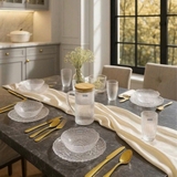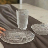 Bộ 6 món gồm 2 cốc – 2 bát – 2 đĩa với thiết kế vân lưới dập nổi thủ công tinh xảo. Tông trắng giúp set phù hợp với nhiều phong cách decor khác nhau, từ tối giản, thanh lịch đến sang trọng. Chất liệu thủy tinh soda-lime cao cấp trong suốt, bền, an toàn, đồng thời tạo hiệu ứng bắt sáng tuyệt đẹp dưới ánh đèn.