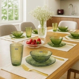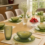 Bộ 6 món gồm 2 cốc – 2 bát – 2 đĩa với thiết kế vân lưới dập nổi thủ công độc đáo. Màu xanh olive sang trọng giúp set phù hợp với nhiều phong cách decor khác nhau, từ tối giản đến cổ điển. Chất liệu thủy tinh soda-lime cao cấp trong suốt, bền, an toàn, đồng thời tạo hiệu ứng bắt sáng tuyệt đẹp dưới ánh đèn.