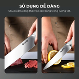Nhờ đó, lưỡi dao lướt qua thực phẩm mượt mà, dứt khoát, giảm ma sát và hạn chế bám dính, giúp cắt thịt mỏng, thái rau đều đẹp, giữ trọn kết cấu và thẩm mỹ của nguyên liệu.