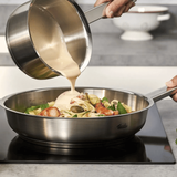 Chảo có kiểu dáng đẹp mắt, tay cầm kim loại cách nhiệt, an toàn khi nấu nướng, dễ vệ sinh và có thể dùng trong máy rửa bát.