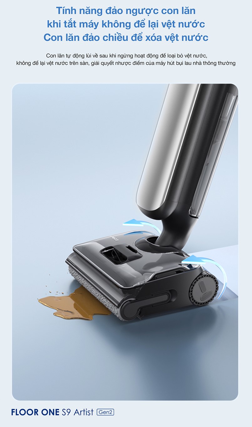 S9 Artist Gen 2 đã được Tineco nâng cấp hàng loạt tính năng để mang lại hiệu suất làm sạch tối ưu nhất, trong đó nhất định phải kể đến tính năng con lăn đảo chiều để xóa vệt nước. Sau khi hoàn thành quá trình lau nhà, tắt máy, chổi lăn sẽ tự động đảo chiều, di chuyển ngược lại để làm sạch hoàn toàn mọi vết nước dư thừa, giúp sàn nhà của bạn luôn khô ráo và sạch sẽ hoàn toàn.