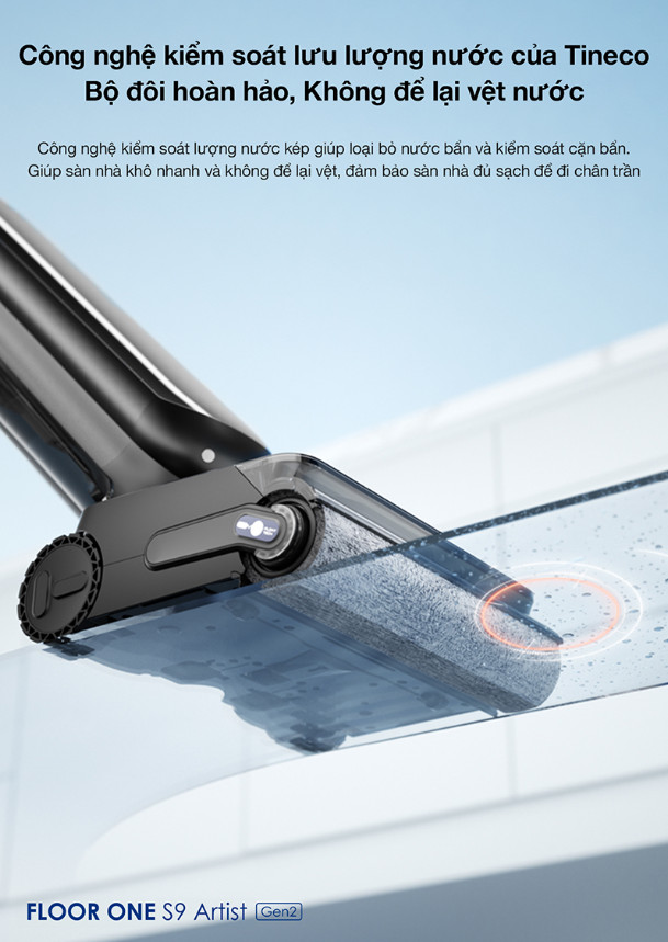Công nghệ Tineco MHCBS™ không chỉ cung cấp nước sạch liên tục mà còn phân phối đều lượng nước trên chổi lăn. Máy lau sàn Tineco Floor One S9 Artist Gen 2 sẽ cạo sạch nước thải ngay lập tức, loại bỏ hiệu quả các vết bẩn cứng đầu bám trên chổi lau sàn, đảm bảo chổi lăn luôn sạch sẽ, sàn nhà được lau sạch bong kin kít. Đặc điểm này thể hiện sự chú ý đến chi tiết và cải tiến trong quá trình làm sạch của Tineco, giúp người dùng đạt được hiệu suất cao và kết quả rõ ràng khi sử dụng sản phẩm.