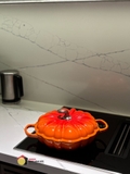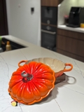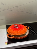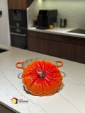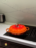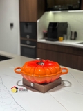 - Đây là dòng Pumpkin Shallow Casserole (nồi hầm/áp chảo hình quả bí ngô), biểu tượng mùa thu của Le Creuset – được làm từ gang tráng men, với thân và nắp tạo hình giống quả bí ngô, đặc biệt ở nắp nồi có núm kim loại hình “cành cây”