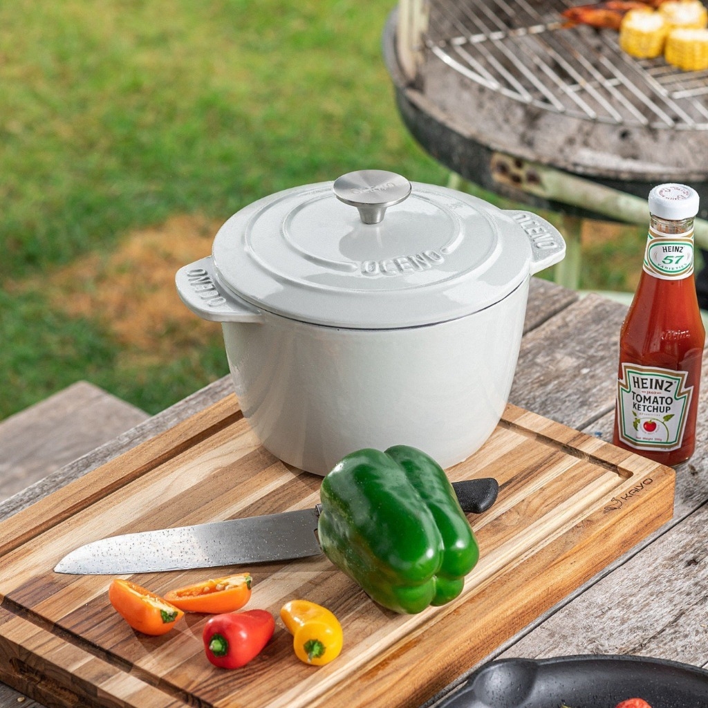 Chất liệu gang tráng men dày dặn giúp truyền nhiệt đều, giữ nóng lâu và tiết kiệm năng lượng. Bề mặt men láng mịn dễ vệ sinh, không bám màu hay mùi thực phẩm. Màu trắng trang nhã phù hợp với mọi không gian bếp và có thể dùng trực tiếp để bày món ăn lên bàn.