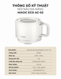 Nồi nấu đa năng Magic Eco AC-02 được thiết kế nhỏ gọn với kích thước chỉ 221 x 165 x 150 mm, phù hợp cho sinh viên, người đi làm hoặc gia đình nhỏ. Thiết bị sử dụng dòng điện 220V ~ 50Hz và sở hữu công suất 500W giúp làm nóng nhanh, rút ngắn thời gian nấu nướng. Dung tích 1.6L cho phép chế biến bữa ăn trọn vẹn cho 1 đến 2 người.