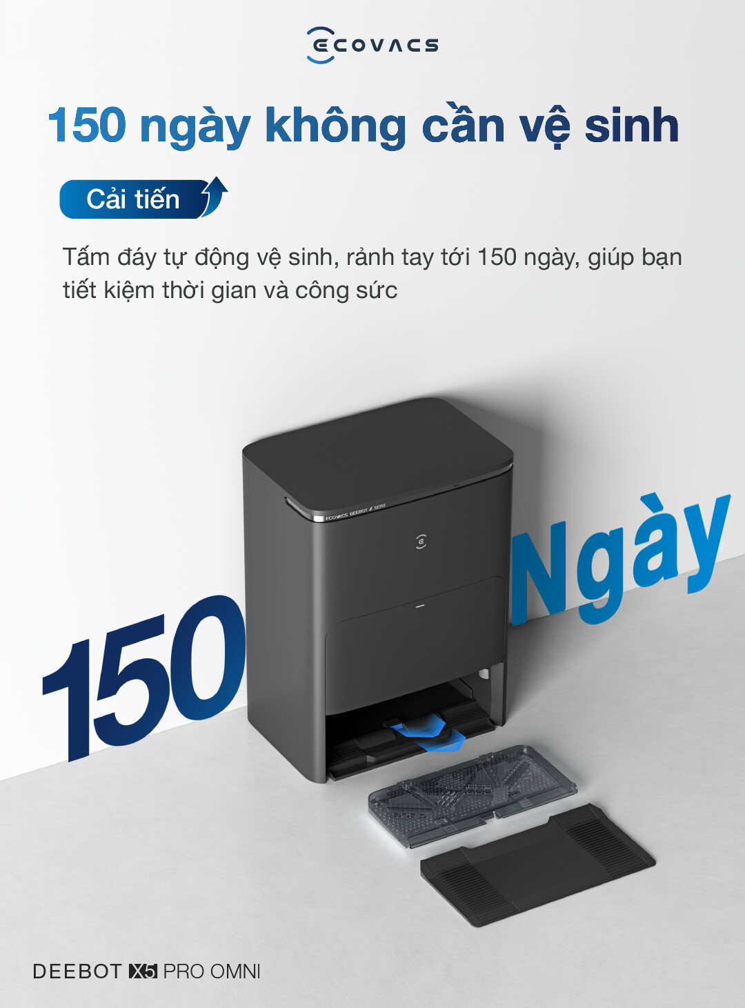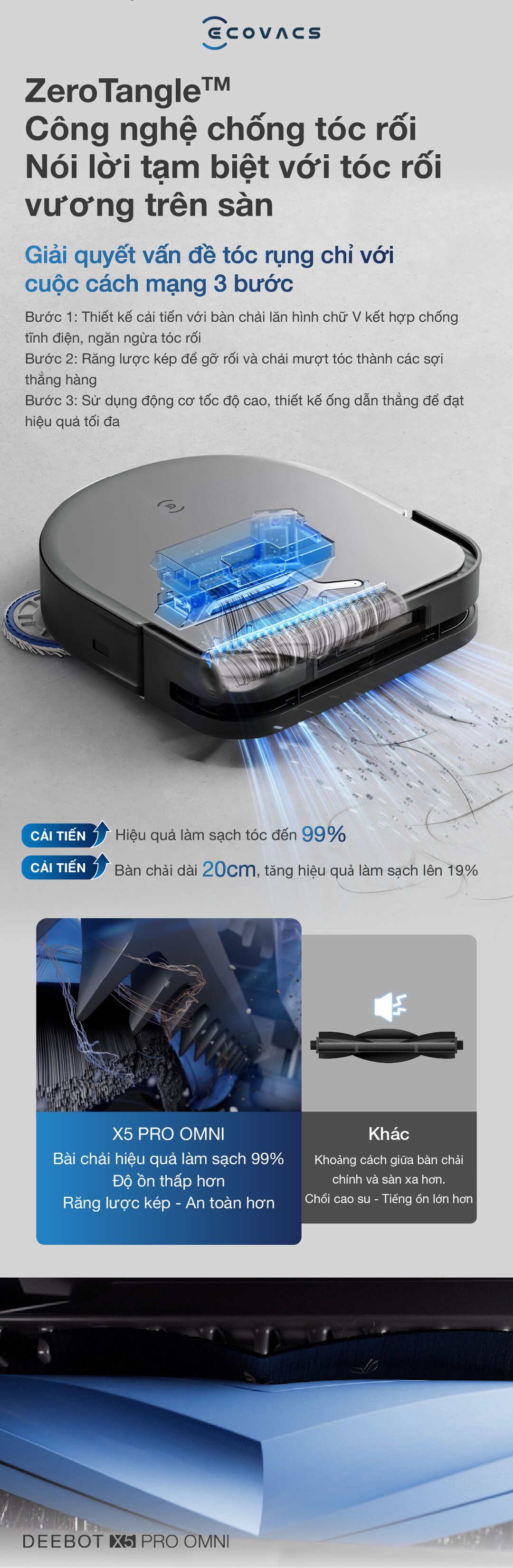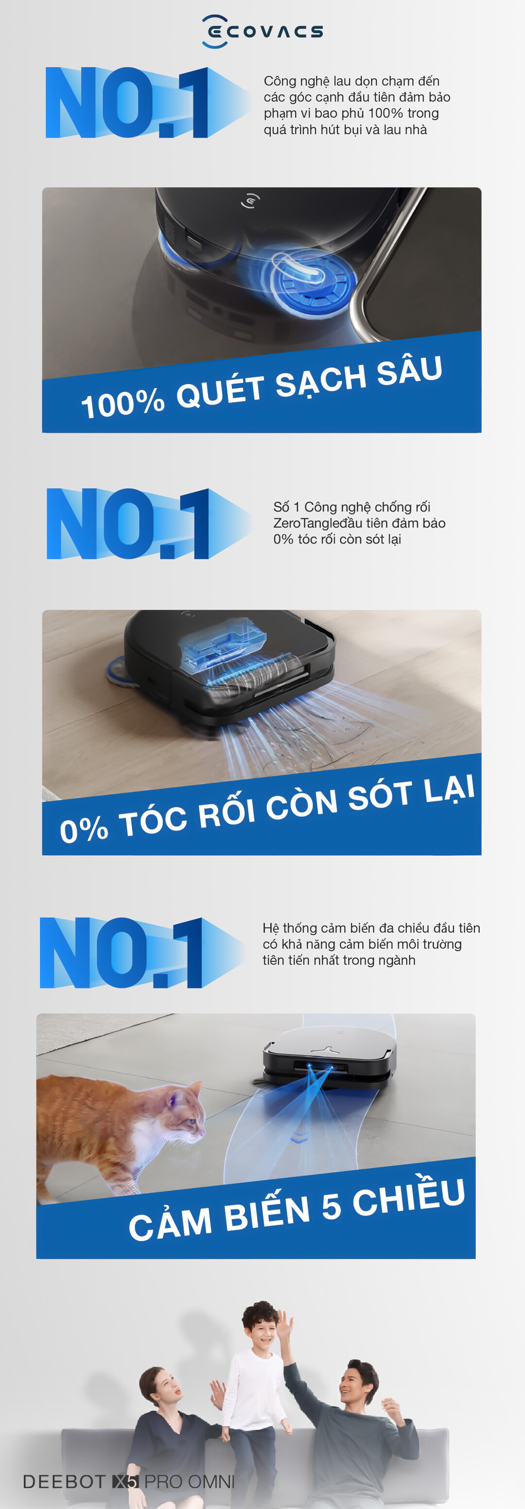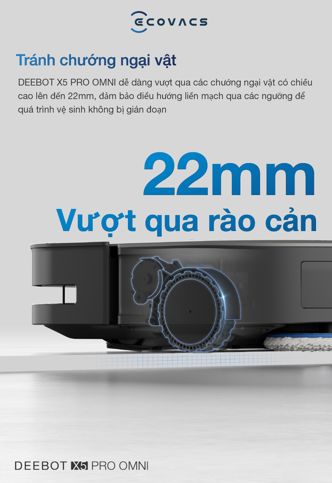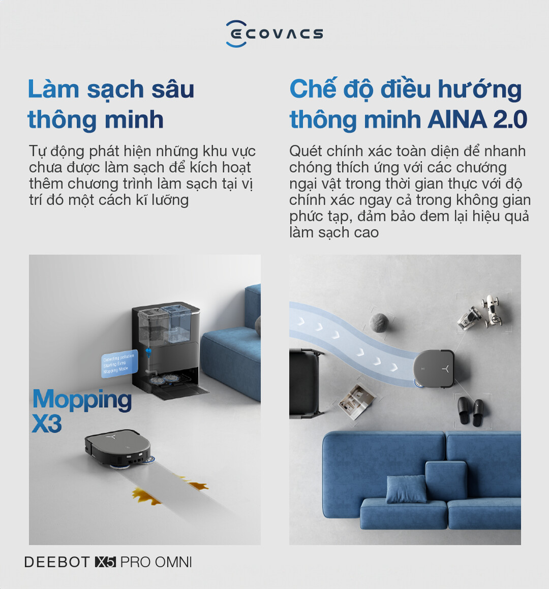 Robot hút bụi lau nhà Ecovacs Deebot X5 Pro Omni tự động đổ rác và giặt sấy giẻ siêu phẩm được nâng cấp lực hút 12.800Pa mạnh mẽ, mô hình AINA 2.0 điều hướng thông minh linh hoạt trong từng bước đi, hoạt động liên tục 164 phút đem lại giải pháp làm sạch nhà vượt trội. Tích hợp công nghệ TruEdge làm sạch cạnh chính xác, ZeroTangle ngăn ngừa tóc vướng, tối ưu hoá vệ sinh máy, lọc tóc rối. Deebot X5 Pro Omni cải tiến trợ lý ảo YIKO AI với mô hình ngôn ngữ mở rộng, nâng tấm lau 15mm, trạm sạc có chế độ tự động vệ sinh với 1 lần chạm, vượt chướng ngại vật cao 22mm, nâng cao hiệu quả làm sạch toàn diện.