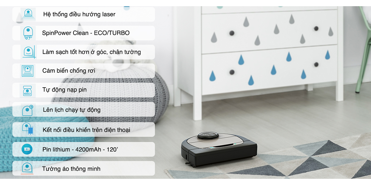 – Hệ thống điều hướng thông minh Smart Laser, hệ thống FloorPlanner™ với tường ảo thông minh, chức năng chia và lựa chọn khu vực vệ sinh.