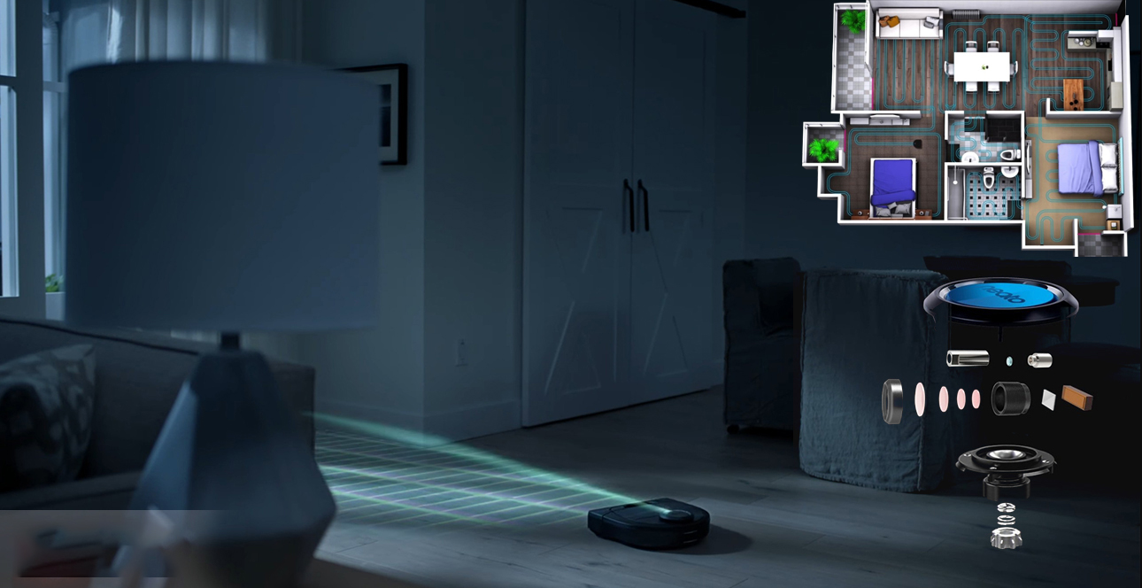 Công nghệ quét laser 360 độ theo phương nằm ngang của Neato D7 giúp xác định vị trí đồ vật và thiết lập bản đồ căn hộ chính xác hơn và không bị ảnh hưởng bởi môi trường thiếu ánh sáng như các loại robot khác