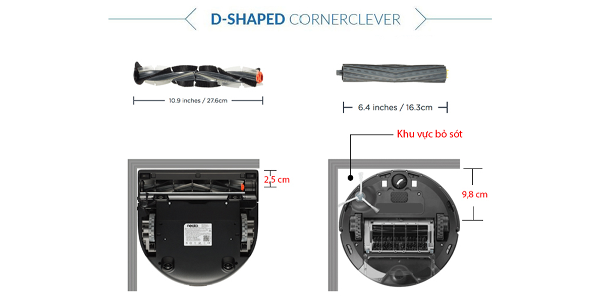 Neato tiếp cận sát và làm sạch các góc, chân tường tốt hơn, kích thước chổi lớn hơn, Neato D7làm sạch nhanh hơn gấp 4 lần so với các robot hình tròn khác