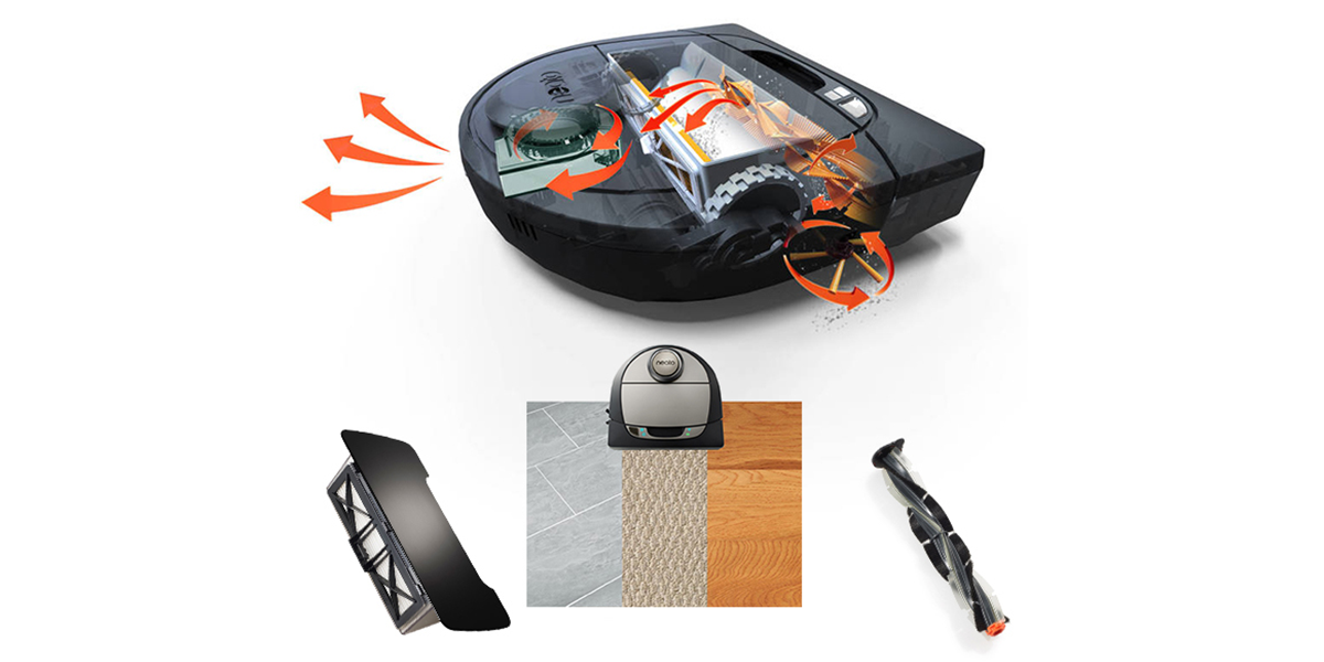 Thiết kế đặc biệt tạo dòng khí xoáy, động cơ hút, ngăn đựng rác và chổi chính lớn giúp Neato có lực hút mạnh mẽ nhất trong các loại robot hút bụi